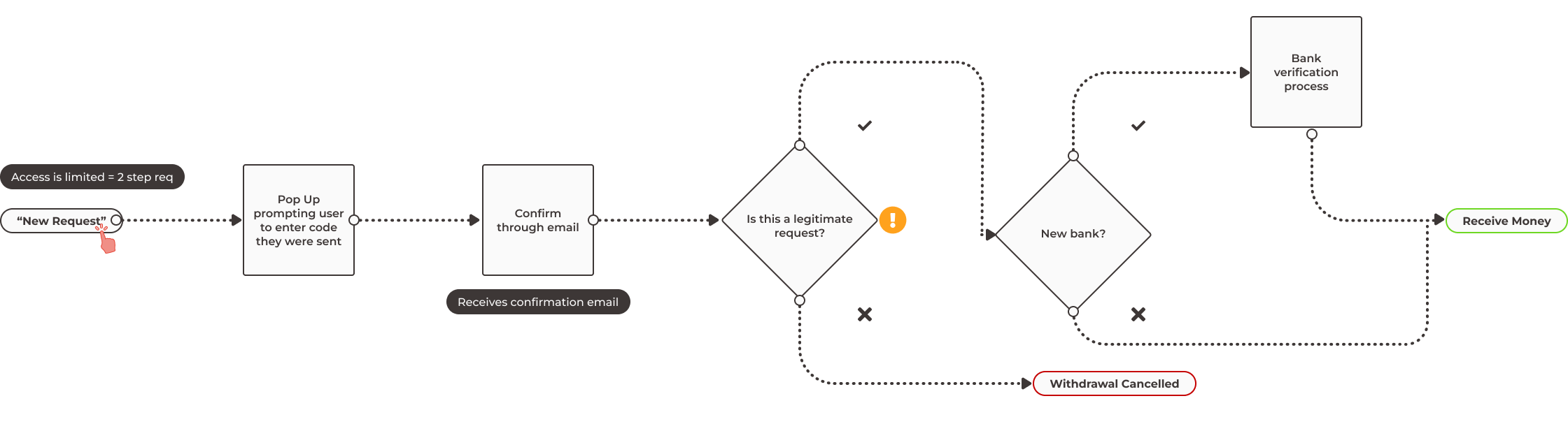 By only allowing users that have 2-step verification set up to request money, I increased the security. I also reduced the amount of work a user had to do by sending the code automatically when they initiated the request, instead of having them press a button.