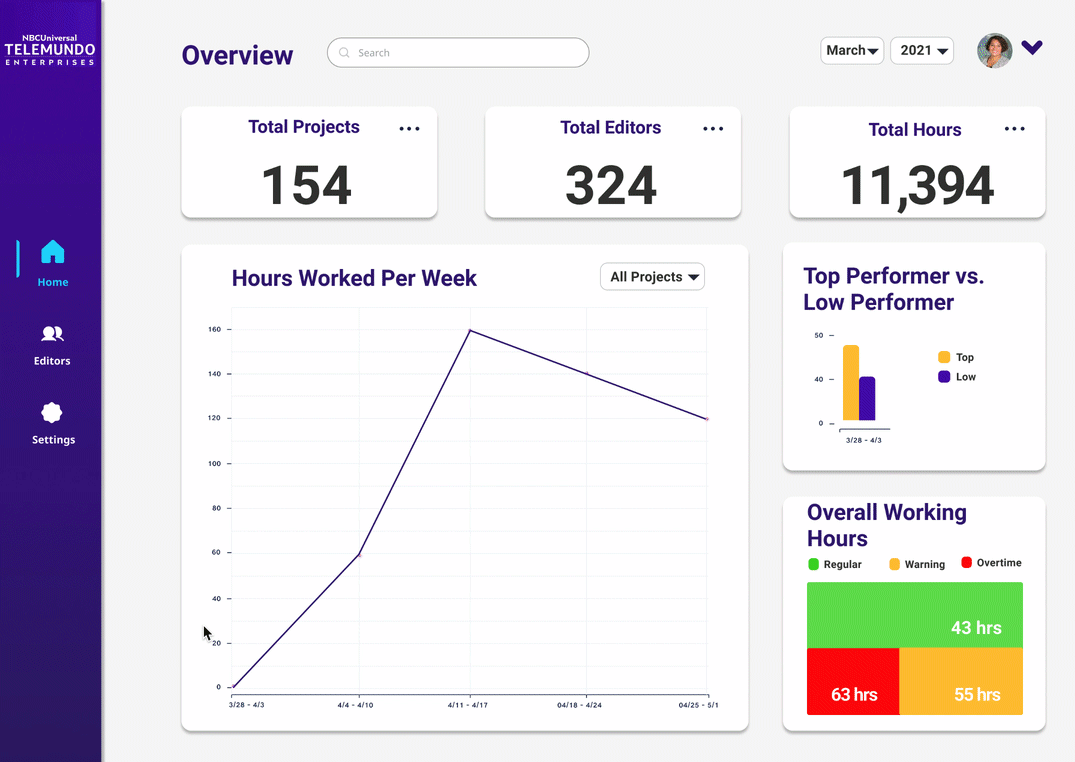 For the Product Designers, we would like to create a way for production managers like Daya, to be able to view an individual editor’s hours and projects. We laid out what it would possibly look like when you select one of the editors by name: