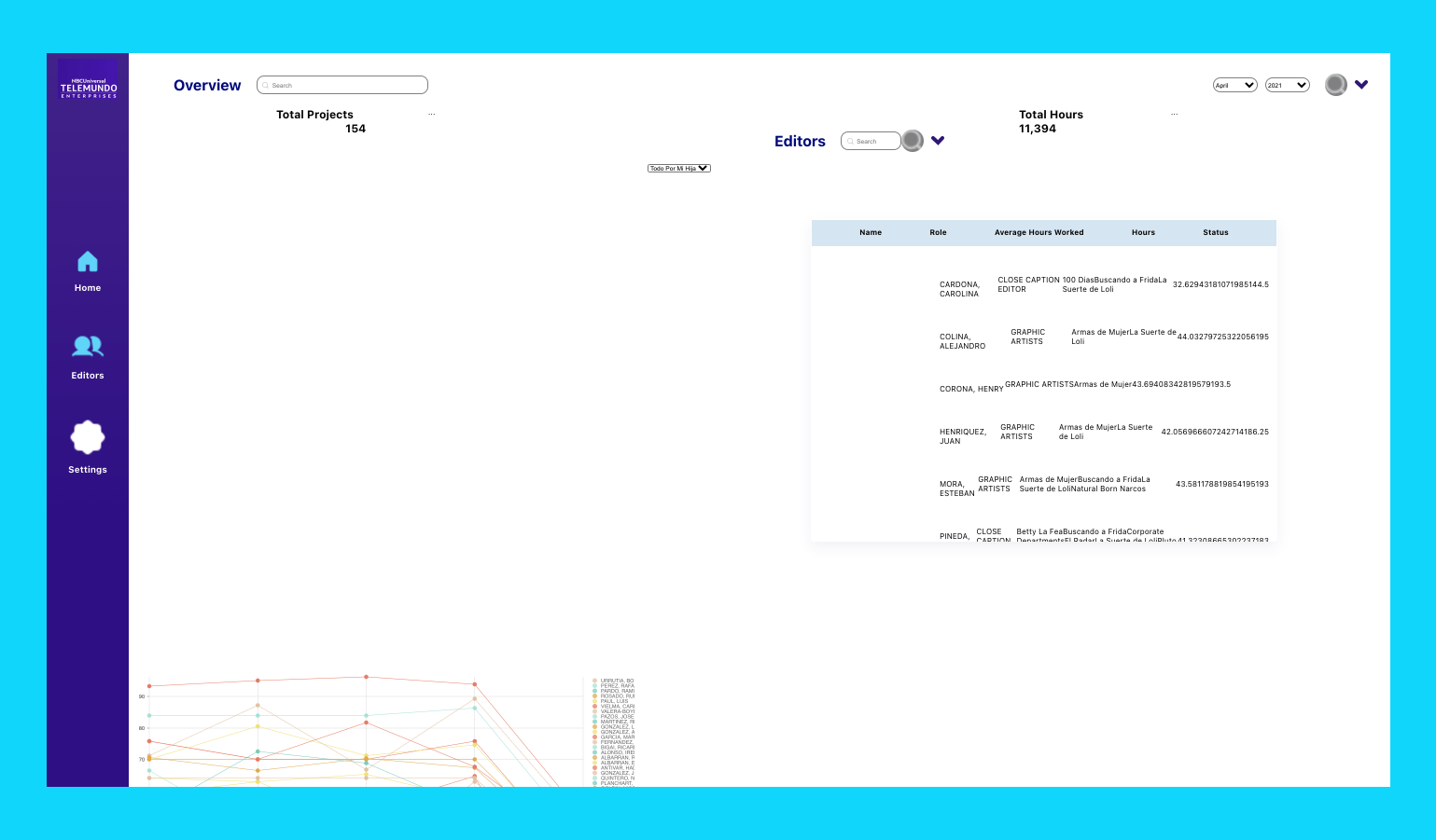A collaborative visualization tool for Telemundo Enterprises to track the hours worked on projects by the editors for the management team.